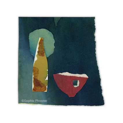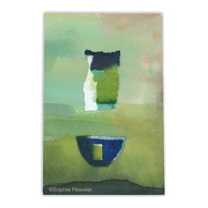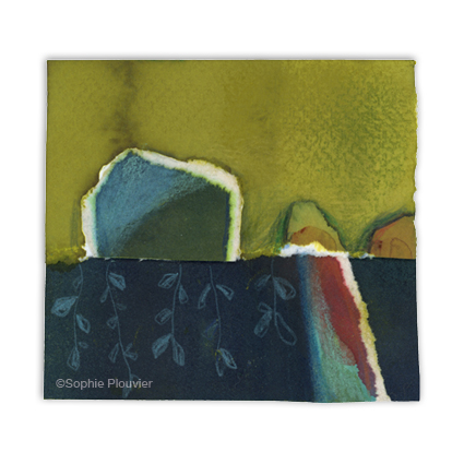 Cette série de papiers découpés, déchirés, a été créée à partir des chutes de papier de mes peintures encres aquarelles. Une série petit format, inspirée par la céramique, les paysages, ré-haussée aux crayons de couleurs et pastels secs.